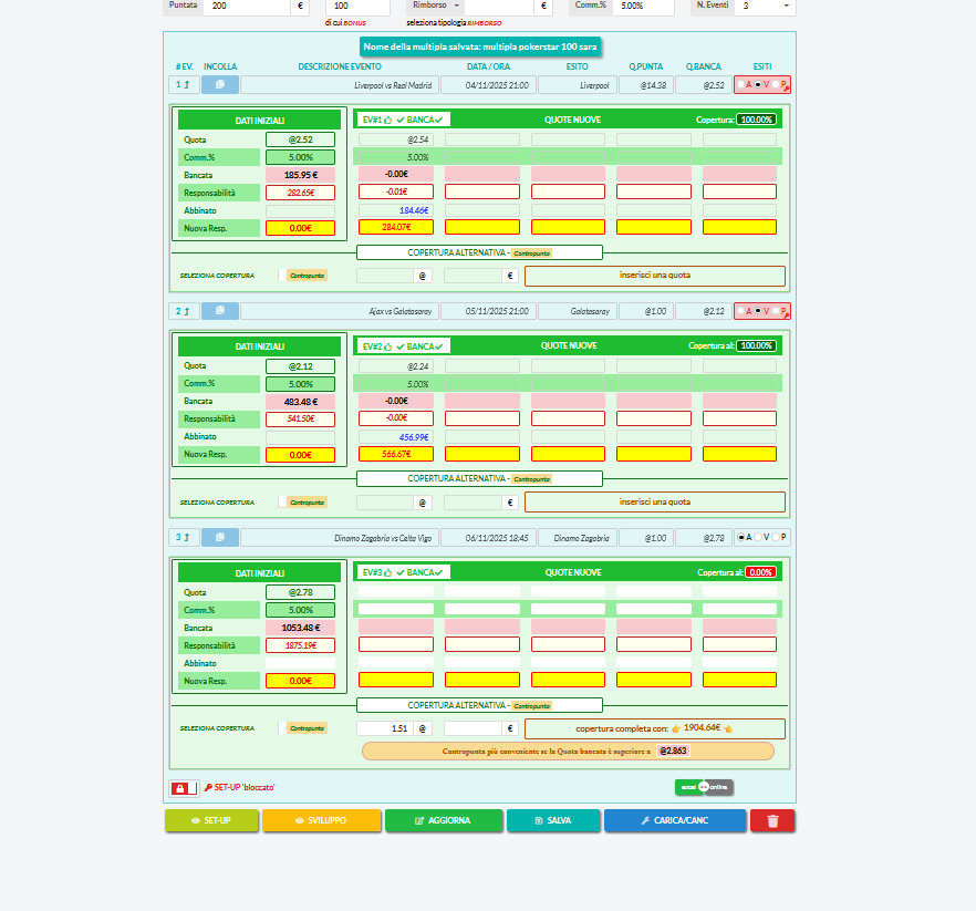 pasquale79167 sono riuscito a coprire tutto purtroppo il bonus di 100 euro di pokerstars ci esce solo 11 euri ma va bene cosi l'errore piu grande che ho fatto e quando ho giocato la multipla una piccola svista nel puntare i 100 euro di bonus ho messo 200 non so cosa mi ha detto il cervello in quel momento ecco perche' forse mi sono trovato con una copertura cosi grande perchè se era da 100 sarei riuscito a uscirne con piu profitto mi sara' da lezione e controllare più di una volta prima di giocare grazie per i consigli e le spiegazioni