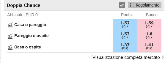 lo sceriffo pasquale79167 come scritto nel post sopra: lo sceriffo Solo il mercato Doppia Chance – per una questione di liquidità – fa riferimento alle Quote Banca del mercato Esito Finale dell'Exchange: DC 1X = banca 2 DC X2 = banca 1 DC 12 = banca X Sono comunque mostrate già convertite in quote punta al netto della commissione, così come avverrebbe utilizzando il Converter. Quindi se vuoi utilizzare le quote punta exchange delle doppie chance, non puoi consultare il Targeter.