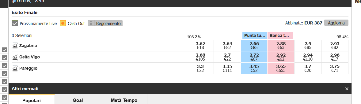 pasquale79167 Ok ho capito una cosa sola tolta la commissione dalla quota e messa sul multi tool devo puntare la cifra che mi indica il molti tool cioe io indico al multitool la quota lui mi dice quanto puntare in questo cc aso 1917 pinto questa cifra sulla puntata dell' Exchange me la prende anche se sulla puntata mi dà liquidità 156 se no la prende ho già visto due book che la danno all' incirca la stessa quota scusate tanto per le rotture ma non mi e mai capitato di coprire cifre del genere e ho una Grande paura di perdere grosse cifre scusatemi ancora spero di perdere stasera così da non imprecare